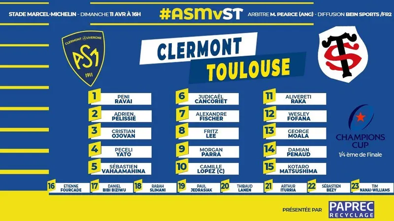 Antoine Dupont, Cheslin Kolbe, Romain Ntamack… Au Stade Toulousain, les individualités capables de faire la différence sont nombreuses. Mais c’est surtout Matthis Lebel que nous vous conseillons de surveiller dimanche. Meilleur marqueur du Top 14, le jeune ailier réalise une saison de haut vol et s’affirme comme un redoutable finisseur. La semaine dernière, il a été l’un des grands artisans de la victoire face au Munster, semant la panique dans la défense irlandaise à chaque accélération. Du côté clermontois, il faudra évidemment garder un œil sur la star japonaise Kotaro Matsushima. Tête d’affiche du recrutement auvergnat l’été dernier, l’arrière a répondu aux espoirs placés en lui et s’est très vite rendu indispensable à son équipe. C’est lui qui a qualifié l’ASM le week-end dernier en inscrivant l’essai de la victoire.