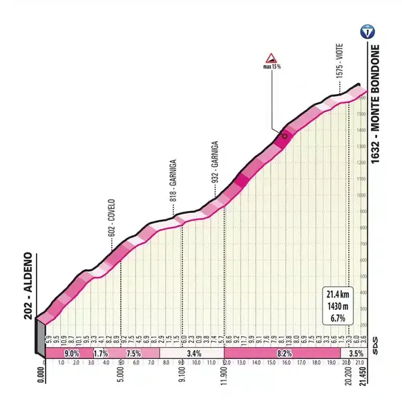 Il faut bien que quelque chose finisse par se passer dans ce Giro, mais il reste à voir si la 16e étape vers Monte Bondone, le premier épisode de la finale montagneuse de cette course, commencera à faire bouger les choses. En principe, le terrain est là, avec les ascensions du Passo di Santa Barbara (12,7 km à 8,3 %), du Passo Bordala (4,5 km à 6,7 %), du Matassone (11,3 km à 5,5 %) et du Serrada (17,7 km à 5,5 %) précédant la montée de catégorie 1 vers Monte Bondone (21,4 km à 6,7 %).