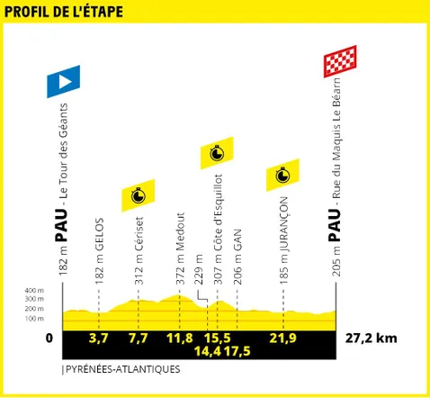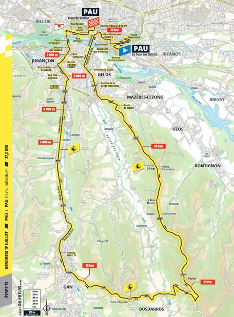 La treizième étape sera le seul et unique contre-la-montre individuel de ce Tour 2019. L’itinéraire sera tracé autour de Pau sur 27 kilomètres. Pau est une ville habituée pour accueillir la Grande Boucle mais ce sera la première fois pour un chrono (plus d’une cinquantaine de fois). Le parcours sera usant surtout dans sa première partie. Puisqu’il va falloir gravir une bosse vers Mazères-Lezons et surtout la Côte d’Esquillot – 1 km à 7 % – après la mi-parcours. Les 9 derniers kilomètres seront plats à travers Gan et Jurançon sauf une petit raidard après la flamme rouge. 2 savant bien grimper sera très à l’aise sur ce type de parcours.