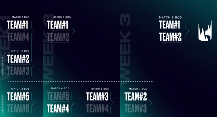 On peut voir sur ce schéma (Source : Riot Games) la délimitation entre les matchs du winner bracket et du loser bracket en fonction des semaines. Tout se passera sur une période de trois semaines.