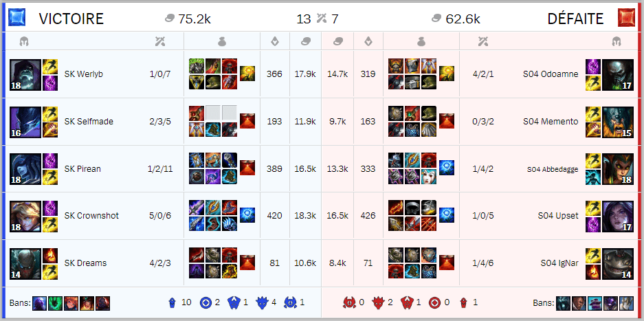 SK profite de l'erreur de choix de Schalke pour se concocter une équipe avec un bon scaling et capable de zoner facilement des adversaires. Le Yorick permettra de créer un splipush en mid-game pas inintéressant. Pour Schalke, une compo sans grosse engage mais avec une grosse capacité de pressure en early game.