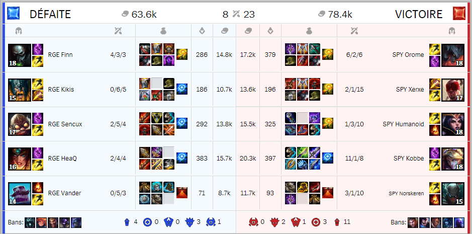 Composition très violente en mid game pour les Splyce face à une composition plutôt safe, qui mise sur le scaling pour les Rogue avec notamment un Corki au mid pour Sencux face à la LeBlanc d’Humanoid. De la mobilité et pas mal de possibilité de catch pour Splyce. Première pour Orome qui remplace Vizicsacsi, très affaibli par des soucis de santé et ne se sentait pas capable de jouer.
