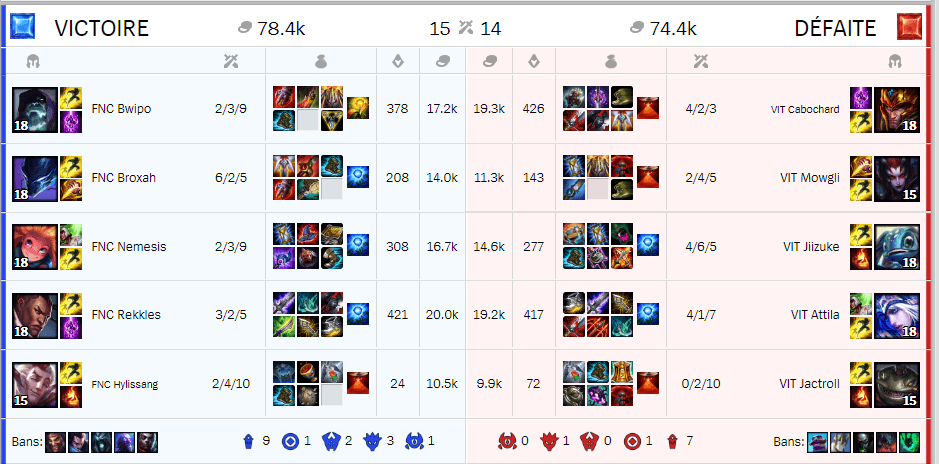Grâce à une invade early et un excellent chemin de jungle Broxah réussit à totalement nullifier l’impact de Mowgli dans les 10 premières minutes. C’est finalement Jiizuke qui s’offre le first blood sur Nemesis mais au prix de sa vie à la 9ème minute. Fnatic reste cependant en avance grâce à un avantage majeur aux CS à la mid lane et au bot, plus des ganks réussis de Broxah. Fnatic prolonge son avance avec un teamfight à la mid lane où les oranges et noirs trouvent un 3 pour 2 et une tourelle après une engage agressive sur Jiizuke. Première tourelle pour Fnatic au bot à 12 minutes de jeu.