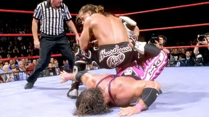 La suite, vous la connaissez, lorsque Michaels va placer Hart dans le Sharpshooter, Vince McMahon ordonna à l’arbitre Earl Hebner de faire sonner la cloche afin de faire “gagner” le titre à HBK alors que Bret Hart n’aura jamais abandonné… Non seulement, il s’est fait humilier devant tout son pays et s’est fait “soumettre” dans sa propre prise… Treize ans de bons et loyaux services bafoués en quelques secondes…