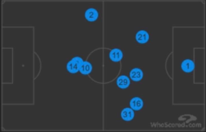 Ce qui fut intéressant aussi dans ce match, c'est de voir qu'Arteta a réussi à donner à cette équipe une structure solide, un équilibre qui lui faisait défaut. Ce qu'on peut voir ci-dessous, ce sont les positions moyennes des joueurs lors du dernier match dirigé par Emery (gauche), et lors du match d'Arteta contre Bournemouth (droite). C'est surtout en attaque que la différence est choquante, là où les attaquants se marchaient dessus, on voit maintenant une vraie organisation où chacun à son rôle défini. Aubayemang ne rentre plus continuellement dans l'axe comme il avait l'habitude de le faire, il laisse cette responsabilité à Lacazette, ce qui lui permet en plus de mieux protéger son couloir en phase défensive.