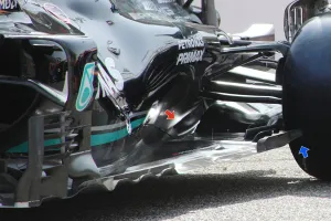 L’écurie allemande a été la première à révéler les détails techniques de son nouveau fond plat, modifié par la réglementation de la FIA pour réduire l’appui des monoplaces. Si le fond plat est simplifié et rétréci, Mercedes a réussi à optimiser ces règles en prolongeant les bargeboards vers l’arrière mais surtout en rétrécissant le châssis autour de la boîte de vitesses. Le fond plat a été travaillé pour mieux guider le flux d’air vers le diffuseur. On a également pu observer des ailettes devant les roues roues, celles-ci étant normalement bannies. Encore une fois, Mercedes a donc trouvé un moyen de répondre aux nouvelles règles.