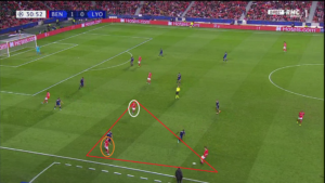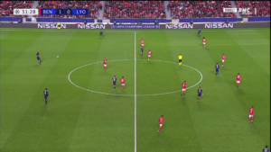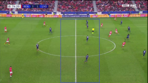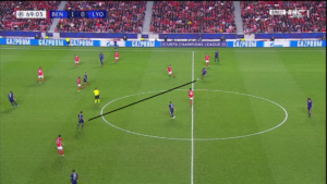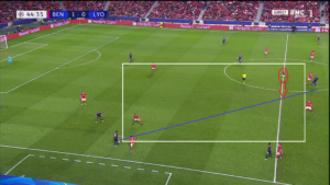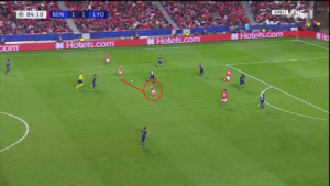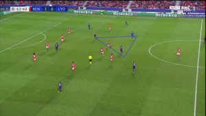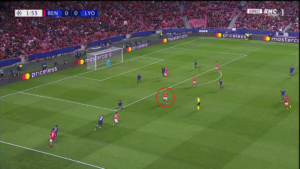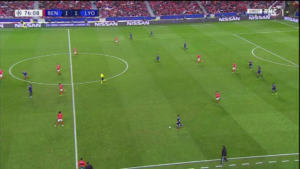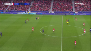 Aouar a parfois été accompagné par Memphis qui, contrairement à son attitude en première période, n’a pas hésité à appeler le ballon plus bas sur le terrain. Ce surnombre a alors mis en difficulté Benfica, et a offert à l’OL de nombreux circuits de passes courts, dont des jeux en triangle.