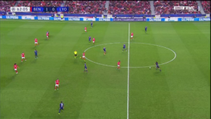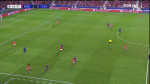 Ici, les seuls circuits de passes courtes sont entre les défenseurs centraux et les latéraux. Les milieux de terrain et les attaquants lyonnais sont tous pris au marquage, et manquent cruellement de dynamisme dans leurs mouvements.