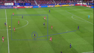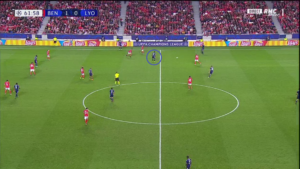Le bloc du SLB a obligé Houssem Aouar (cercle bleu) et Lucas Tousart à décrocher bas sur le terrain. Mais tandis que l’orientation du jeu à partir d’une position basse n’est pas le point fort du numéro 29 lyonnais, la présence des deux joueurs aux cotés de leurs défenseurs supprime logiquement la possibilité de trouver un éventuel relais au milieu de terrain (voir deuxième et troisième image). Encore une fois, cela a poussé les latéraux vers du jeu long (voir deuxième image).
