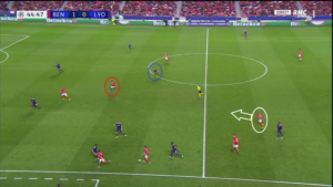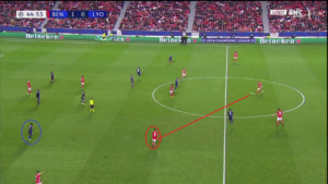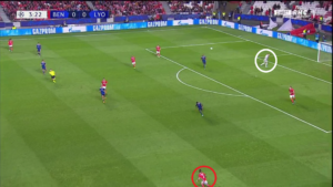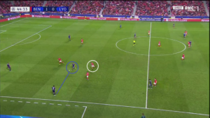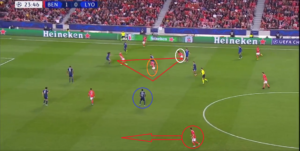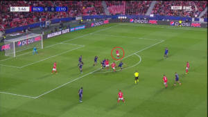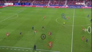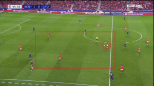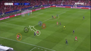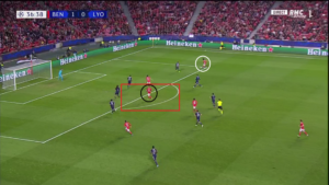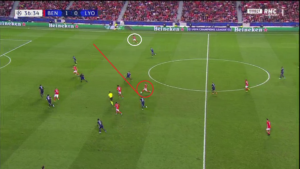 Dès le début de la rencontre, un espace conséquent est laissé à Alejandro Grimaldo (cercle rouge), le latéral gauche du SLB. L’Espagnol est un joueur très adroit techniquement et dotée d’une belle vision du jeu, qui n’hésite pas à quitter son couloir lors des matchs afin d’apporter le surnombre dans l’axe et mettre à profit des qualités qui s’apparenteraient à celles d’un meneur de jeu. Le laisser seul aux abords de la surface, qui plus est dans une position axiale, est donc une énorme erreur de placement défensif de la part des Gones. Un point qui sera l’un des problèmes majeurs pour les hommes de Rudi Garcia.