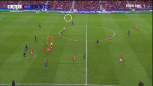 A la conclusion de l’action, pas moins de six lyonnais sont présents contre quatre joueurs de Benfica. Mais aucun d’entre eux ne prend l’information dans son dos, comme à de nombreuses reprises dans la rencontre, et Rafa (cercle rouge) est complètement esseulé pour ensuite conclure sans soucis.
