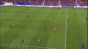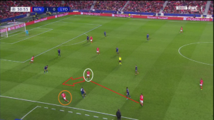 Placé sur la gauche du 4-4-2 à la place de Terrier après l’entrée en jeu de Mendes, Aouar (cercle bleu) ne s’est pas contenté de rester dans son couloir. L’international espoir a régulièrement dézoné pour apporter de la présence dans l’axe, offrant davantage de solutions au porteur de balle, et notamment entre les lignes.