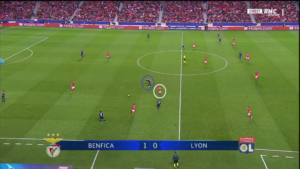 Suite à l’égalisation logique de Memphis, Benfica a eu du mal à attaquer de manière coordonnée face à un bloc lyonnais bien organisé. En témoigne cette séquence où le SLB est littéralement coupé en deux.