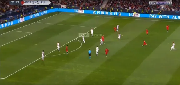 Shaqiri reçoit ici le ballon dans le dos de Carvalho (cercle rouge), et dispose de plusieurs mètres pour avancer en direction du but entre les milieux et les défenseurs portugais.