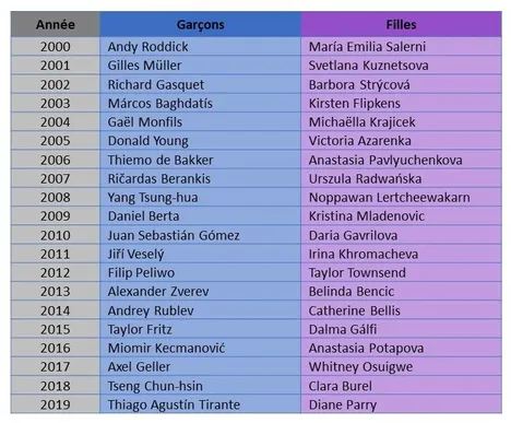 On le sait, la carrière d’un joueur de tennis est parsemée d’étapes qu’il ne faut pas brûler. Généralement, le circuit junior est un passage obligé. Mais, évidemment, la réussite chez les jeunes n’est pas gage de réussite chez les adultes. La transition est compliquée et nombreux sont les joueurs qui n’y sont jamais parvenus. On peut le vérifier en observant les champions et championnes du monde juniors (ici depuis 2000) : certes, certains sont devenus des top players, mais d’autres n’ont jamais vraiment réussi à percer plus haut que le top 50 (ce qui n’est déjà pas donné à tout le monde) et quelques uns sont même de complets inconnus.
