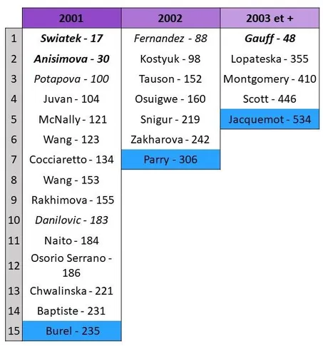 Si on prend en compte les 3 dernières championnes du monde junior françaises et que l’on compare leur classement chez les adultes avec les autres joueuses de leur âge, on peut s’apercevoir qu’elles sont déjà en retard. Parmi les jeunes de 19 ans et moins, Clara Burel, Diane Parry et Elsa Jacquemot ne sont respectivement que 21ème, 24ème et 47ème. Devant, on retrouve des filles comme Iga Swiatek, Amanda Anisimova, Cori Gauff ou encore Marta Kostyuk. Le cas de Clara Burel est particulier. En effet, elle était blessée en 2019, juste après son sacre en junior et n’a pas eu de véritable première saison chez les pros. Elle s’est véritablement révélée en 2020, année pendant laquelle on l’a vu réaliser un beau parcours à Roland Garros notamment. Pour les deux autres, c’est ce que j’explique plus haut, elle n’ont tout simplement pas encore participé à assez de tournois ITF ou WTA. Ainsi, elles ont déjà un retard de points au démarrage de leur carrière pro.