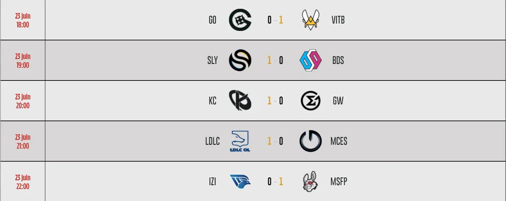 En difficulté durant le spring split, Solary et LDLC OL sont les équipes qui surprennent en ce début de summer, avec une nouvelle victoire ce 23 juin 2021. Les favoris Vitality.Bee, KCorp et Misfits Premier sont toujours au rendez-vous.