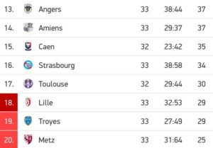 A cinq matchs de la fin du championnat, chaque point pris par ces équipes du bas de classement est important pour la course au maintien. On parle souvent de la “règle des 40 points”, ces quarante points qui assurent une saison suivante en Ligue 1. Après la 33ème journée, toutes les équipes après la 13ème place n'ont pas encore atteint ce palier :