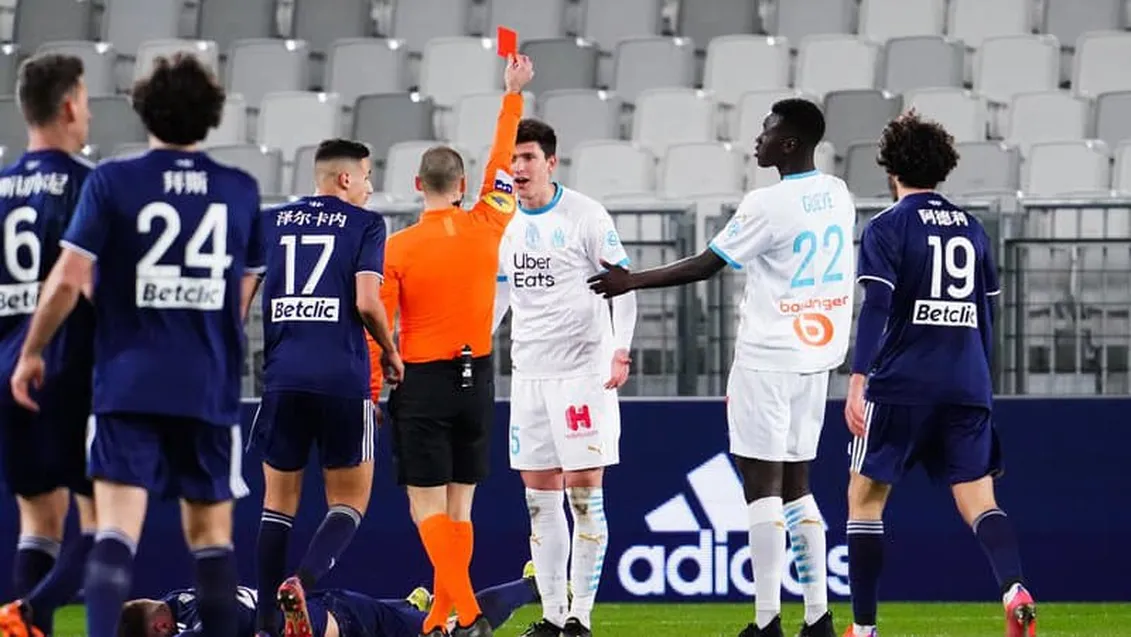 Les Phocéens poursuivent leur marche en avant. Idéalement servi dans la profondeur, Valère Germain se troue complètement devant le portier bordelais. Immédiatement, les Girondins lancent la contre-attaque. Leonardo Balerdi, le défenseur central marseillais, accroche Rémi Oudin, qui partait seul au but. La décision de l’arbitre Jérôme Brisard est irrévocable. L’Argentin écope d’un carton rouge (55e).
