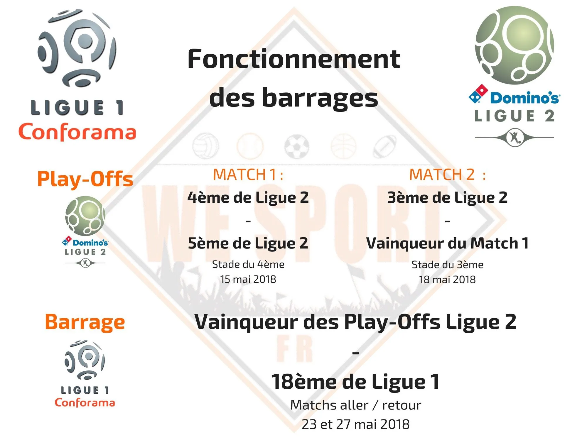 - enfin, le vainqueur de ces oppositions se voit jouer le 18ème de Ligue 1 pour les barrages finaux et décider de quelle équipe jouera la première division la saison prochaine.