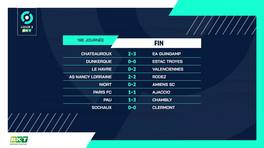 Troyes leader du championnat se déplaçait sur la pelouse de Dunkerque qui enchaînait les mauvais résultats. Les Troyens n’ont pourtant jamais réussi à marquer dans un match qu’ils ont ultra dominé face aux Nordistes. Les Troyens se sont pourtant procurés un nombre d’occasions énorme à en perdre la tête avec notamment deux ballons qui ont été déviés par les montants sans franchir la ligne. Troyes reste leader en attendant le match de Toulouse lundi.