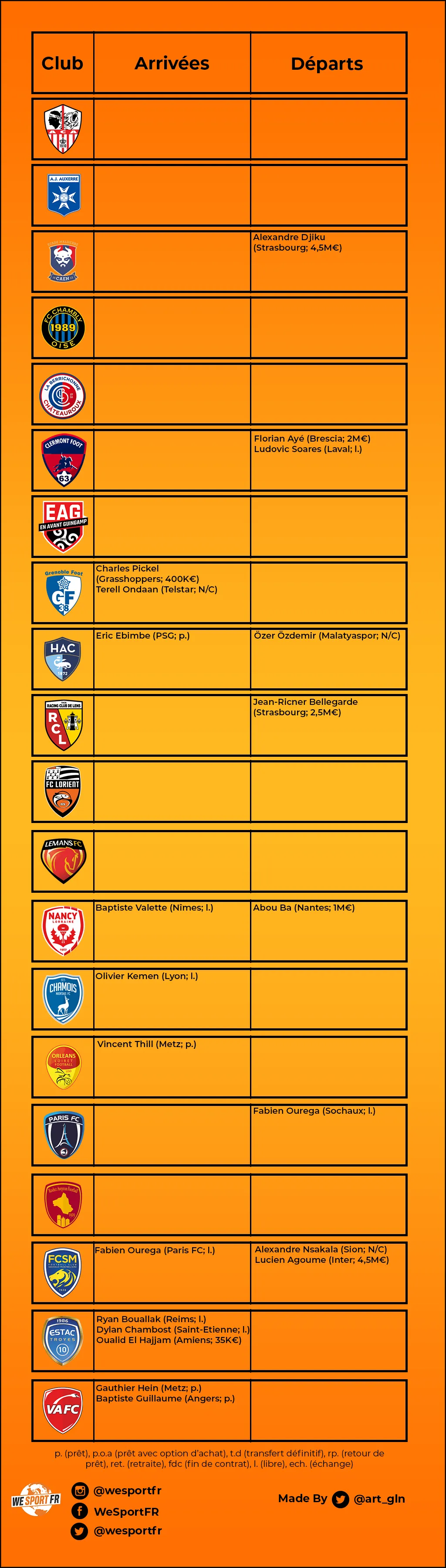 De ce fait, les clubs ont pu débuter ou continuer leur mercato. Nancy, qui possédait déjà quatre signatures réalisées pendant la saison 2018/2019, vient d’ajouter un cinquième joueur au carnet en la personne de Baptiste Vallette. Le gardien désormais ex-nîmois va pouvoir se relancer et trouver une place de titulaire en lieu et place de Guy Roland Ndy Assembe, qui a quitté le club la semaine dernière. Du côté de Sochaux, Fabien Ourega, ex-joueur du Paris FC, a paraphé un contrat avec les Lionceaux. Devraient suivre Jérémy Livolant (Guingamp) en prêt, et un essai pour Christophe Diedhiou, libre depuis son départ de Créteil.