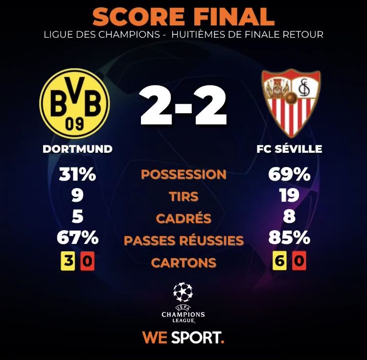 Le Borussia Dortmund reçoit le FC Séville lors des huitièmes de finale retour de la Ligue des Champions. Une rencontre qui se termine sur un résultat nul entre les deux formations (2-2). Les Allemands se qualifient grâce au résultat du match aller (3-2).