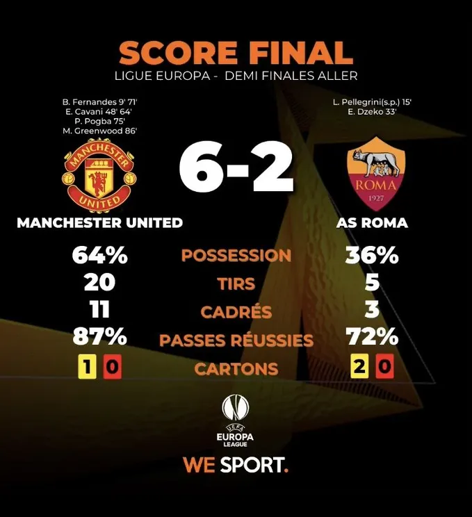 Quatre minutes plus tard, Paul Pogba se rattrape de son erreur de la première période et fait couler l’AS Roma d’une tête croisée en infligeant le cinquième but des Red Devils (5-2). Un sixième but vient crucifier la Roma quatre minutes avant la fin du match signé Mason Greenwood d’une frappe croisée déviée par le gardien romain dans son propre but (6-2). Manchester United est à 99,9% en finale de Ligue Europa !