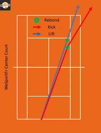 Ici, on observe bien la différence de trajectoire (vu de dessus) entre un service lifté classique (en bleu) et un service kické (rouge) après le rebond. Avec le kick, la balle vient sortir un peu plus des limites du court. L’effet se prend essentiellement au moment où la balle rebondit. C’est à ce moment qu’elle change de trajectoire. Votre adversaire devra alors parcourir au moins un mètre de plus pour parvenir à relancer la balle. En plus, la balle devrait être, en théorie, plus courte qu’un service lifté traditionnel. Le relanceur est alors dans l’obligation d’anticiper un peu pour soit reculer soit prendre la balle le plus tôt possible, mais nous verrons ça un peu plus tard.