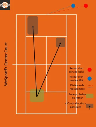 Mouai, bof ce service, on peut pas faire d’ace avec… Non en effet, il n’a pas vocation à gagner le point en un coup. Mais je suppose que vous imaginez la suite. Le kick va nous ouvrir le court. L’adversaire étant excentré comme jamais, il aura une bien plus grande distance à couvrir pour se replacer. Et le plus souvent, il renverra une balle moyenne au milieu du terrain. C’est sur cette balle que vous gagnerez le point. Vous n’aurez pas de mal à contourner votre revers pour frapper un coup droit. Et la, tout le court s’ouvre à vous. Envoyer une balle plein coup droit, loin de l’adversaire ou bien un petit court croisé pour le prendre à contre pied dans son replacement… c’est vous qui choisissez. Vous m’en direz des nouvelles ! Allez, puisque vous en redemandez, je vous remontre notre fameux Court Central. On remarque qu’après un service lifté, le relanceur, en plus d’être moins gêné, peut se replacer sereinement. Après un kick, il sort des limites du terrain et devrait renvoyer une balle plutôt molle au milieu du terrain. Sur notre court, j’ai supposé qu’il remettait une balle à mi-longueur, côté revers. On peut facilement la contourner ou même la prendre montante en revers.