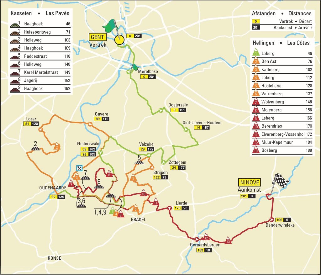 Si visuellement, il est difficile à comprendre, le parcours emprunte une première partie indiquée par la couleur verte sur la carte, jusqu'à Oudenaarde, où la course devrait être calme hormis une éventuelle bagarre pour prendre une échappée. Le peloton prendra alors le tracé orange d'Oudenaarde à Brakel avec le début des hostilités notamment à mi-course (201 kilomètres à parcourir) puisque du Katterberg au kilomètre 102 au kilomètre 172 avec l'Elverenberg, il y aura 9 ascensions et 7 secteurs pavés en 70 kilomètres, de quoi faire un écrémage pour ne garder qu'un petit groupe de favoris dans la partie rouge qui aura débutée au kilomètre 138 après Brakel pour rejoindre Ninove, 201 kilomètres depuis le départ de Gent. Ce petit groupe qui aura passé les 70 kilomètres intenses du circuit se retrouvera pour une explication finale dans le mythique enchaînement Mûr de Grammont – Bosberg dans les 20 derniers kilomètres de course.