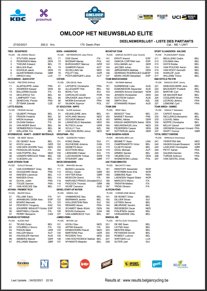 Toutes les réponses à ces questions seront données demain, aux alentours de 16h45 pour l'arrivée de cette édition 2021 du circuit de l'Omloop Het Nieuwsblad.