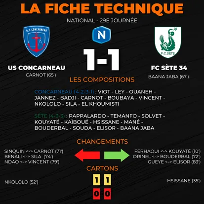 L’attaquant camerounais vient d’inscrire son troisième but en championnat, le deuxième à l’extérieur et surtout le deuxième face à Concarneau. Sète est de retour dans la partie. Après ces 3 minutes de folie, c’est l’accalmie. Le rythme est clairement retombée et les deux équipes ne se livrent plus. Une excellente intervention de Temanfo sur Benali vient rassurer les Sétois (82e). Daouda Gueye remplace Simon Elisor pour les 10 dernières minutes. Dans le temps additionnel, il est servi d’une astucieuse talonnade par Souda mais la frappe du joueur prêté par Rodez est contrée.