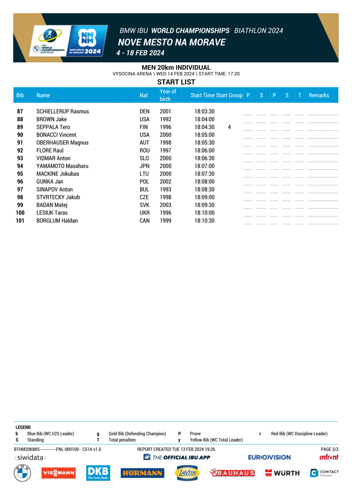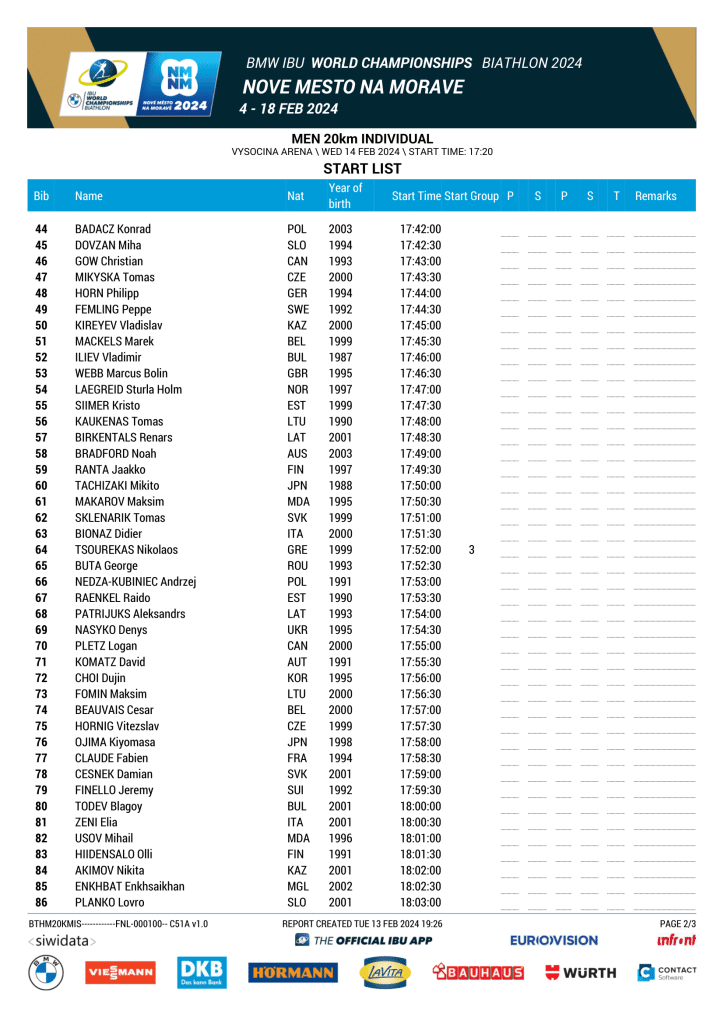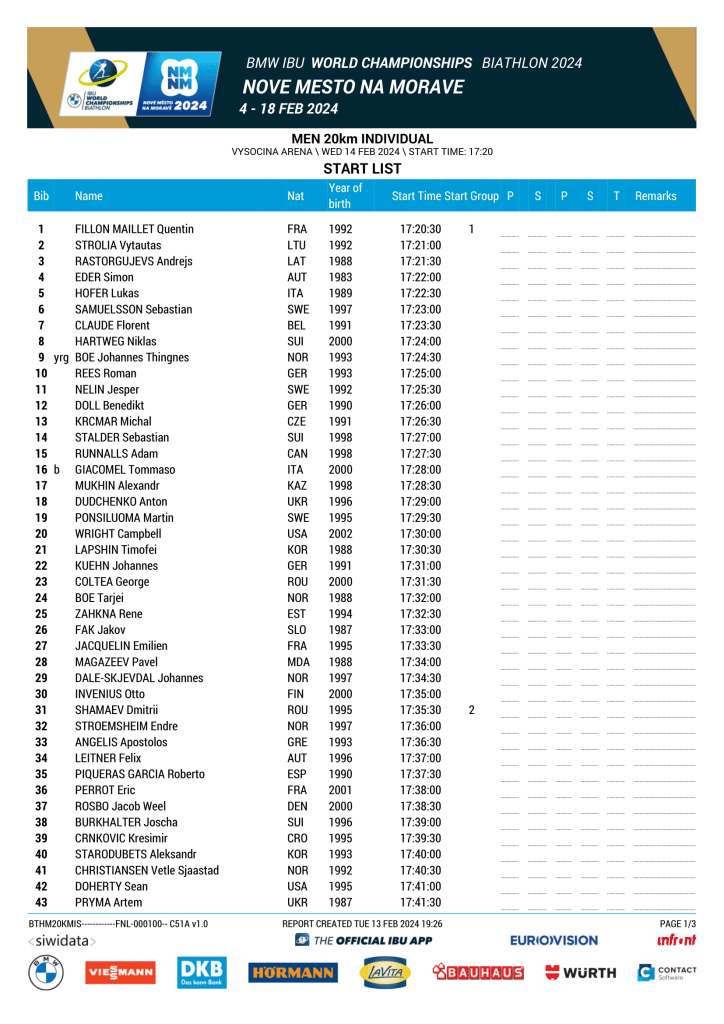 LA LISTE DE DÉPART DE L'individuel HOMMES DES CHAMPIONNATS DU MONDE BIATHLON 2024