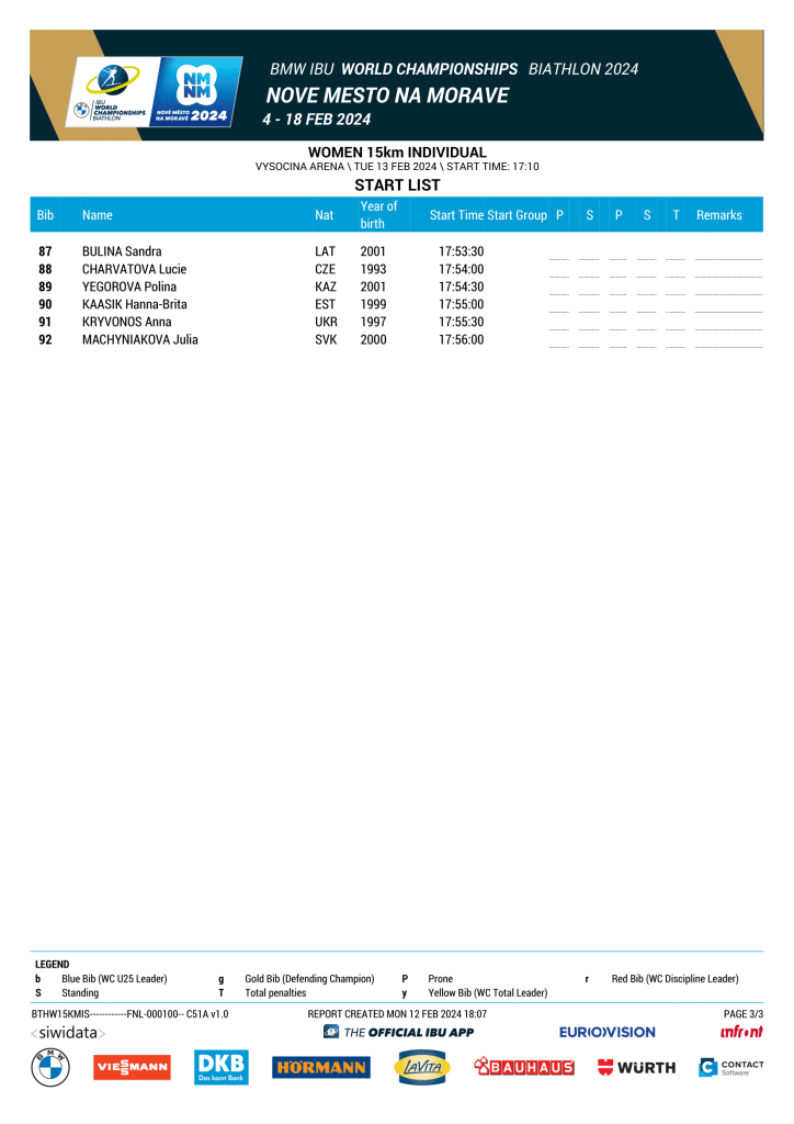 Ce mardi 13 février, à 17h10 aura lieu l'épreuve de l'Individuel Femmes des Championnats du Monde 2024 de Biathlon à Nove Mesto (République tchèque). Découvrez sans plus attendre la liste de départ de la course.
