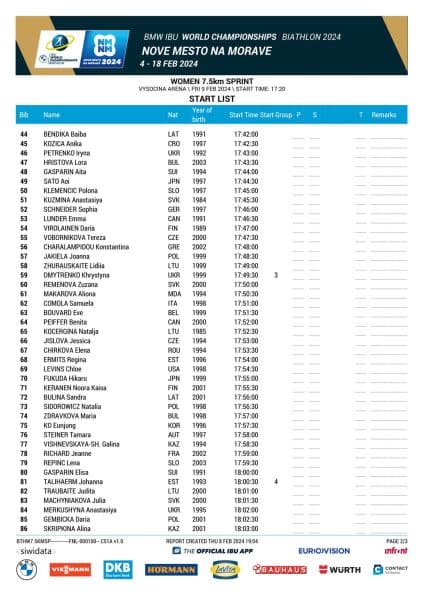 C'est à partir de 17 h 20 que le sprint individuel femme aura lieu ce vendredi 9 février 2024 à Nove Mesto. Côté Français, c'est Julia Simon qui s'élancera en première avec le dossard numéro 2. C'est l'Estonienne Tuuli Tomingas qui lancera les hostilités.