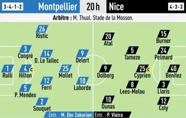 Pour le Montpellier Hérault, c’est devenu une habitude, Der Zakarian reconduit son 5-3-2. Seul changement probable par rapport au dernier onze, Oyongo devrait céder sa place à Ristic pour le poste de piston gauche. Devant, le duo complémentaire Delort–Laborde va devoir déstabiliser une défense niçoise encore remaniée. Dante, Hérelle et Malang Sarr sont encore incertains.