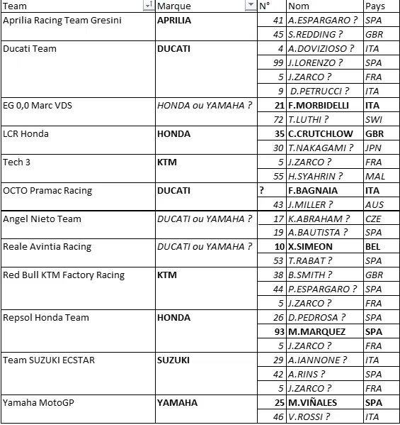 Le Français et son coach, Laurent FELLON, qui n’ont pas caché leurs intentions pour 2019, ils souhaitent une moto d’usine, condition sine qua none pour gagner un championnat en MotoGP et atteindre le titre suprême. Laurent FELLON qui indiquait à nos confrères de paddock-gp.com que tout le monde l’appelait reconnaissait cependant que seuls quelques options restaient intéressantes. En effet les comptes sont rapidement faits puisque seuls 3 ou 4 guidons pourraient s’avérer être ceux qui mèneraient à la victoire. Dani PEDROSA, avec des résultats en demi-teinte sur les saisons précédentes, et pas forcément dans les petits papiers d’Alberto PUIG, désormais team manager de Honda HRC , pourrait se voir remercié et libérer une place de choix. Du côté des rouges, Jorge LORENZO, bien qu’ayant toujours la confiance de Gigi DALL’IGNA, peine à trouver ses marques et pourrait repartir, comme son illustre ex-coéquipier, sans l’ombre d’une victoire de chez Ducati. Il ne faut oublier non plus, le très médiatisé (mais pas pour de bonnes raisons) Andrea IANNONE qui n’aura certainement pas une chance de plus au sein du team Suzuki s’il ne performe pas cette année. Enfin et pour terminer, il convient de ne pas écarter le team d’usine KTM qui progresse à la vitesse de l’éclair et qui serait tout à fait capable de fournir des machines aptes à faire un podium en 2019 et à gagner en 2020.