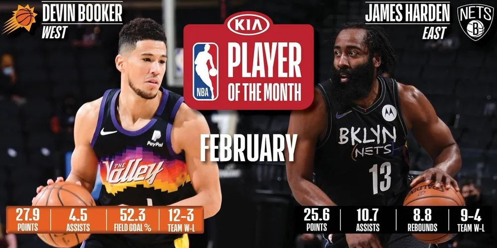 Chez les joueurs du mois, ce sont les guards qui ont pris le pouvoir ! Après une doublette de pivot en janvier (Nikola Jokic et Joël Embiid), ce sont Devin Booker (Phoenix Suns) et James Harden (Brooklyn Nets) qui ont été récompensés. Deux joueurs qui sortent d’un mois de très haute volée et qui auraient dû être coéquipiers lors du All-Star Game si Devin Booker n’avait pas dû déclarer forfait.