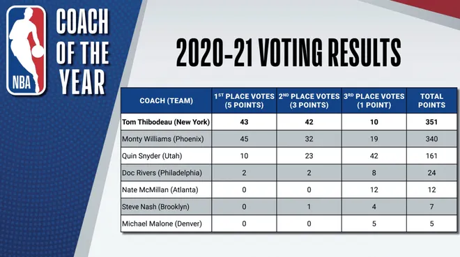 Les résultats ont été très serrés puisque Tom Thibodeau (351 pts) devance de seulement 11 points Monty Williams (340 pts), l’entraîneur des Suns.