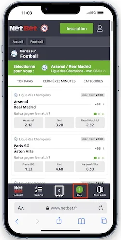 Vous pourrez ensuite faire vos paris Live sur NetBet :