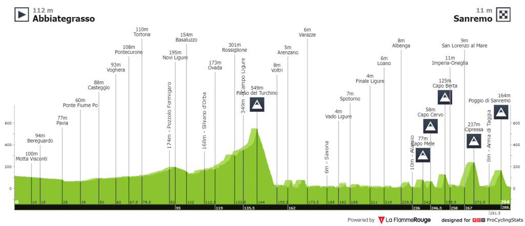 Milan-San Remo ne commence pas à Milan cette fois-ci, mais à Abbiategrasso. Cela n'aura aucune incidence sur le résultat, puisque la distance reste plus ou moins la même : 294 kilomètres. Et, comme toujours, le final emblématique avec la Cipressa et le Poggio avant une descente rapide sur la Via Roma à San Remo reste inchangé.