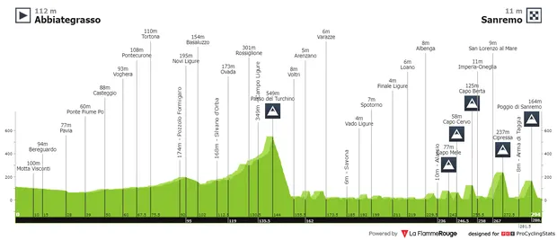 Milan-San Remo ne commence pas à Milan cette fois-ci, mais à Abbiategrasso. Cela n’aura aucune incidence sur le résultat, puisque la distance reste plus ou moins la même : 294 kilomètres. Et, comme toujours, le final emblématique avec la Cipressa et le Poggio avant une descente rapide sur la Via Roma à San Remo reste inchangé.