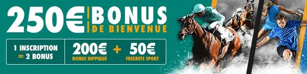 - Bonus de bienvenue turf : jusqu’à 250€ de bonus offerts