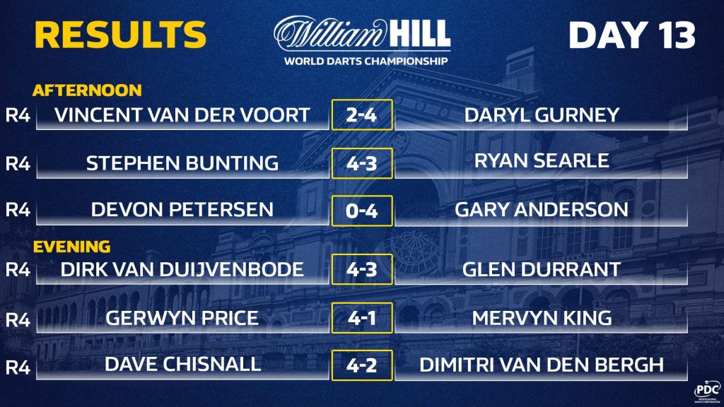 Si van Gerwen semble se diriger vers un titre mondial à la vue de son niveau de jeu et sa capacité à rester ultra solide mentalement, son compatriote Dirk van Duijvenbode lui n'avait rien à perdre en venant à Londres pour disputer son deuxième mondial (éliminé premier tour en 2015). Déjà auteur d'un exploit sur Rob Cross numéro 5 mondial, le batave a remis cela hier face à Glen Durrant, numéro 12 mondial, une victoire là aussi 4-3 qui lui permet d'atteindre un quart de final inespéré encore il y a 10 jours.
