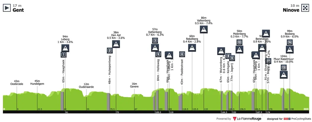 Après avoir traversé Zottegem et Zwalm, les coureurs traverseront le secteur pavé de Haaghoek, long de 2000 mètres, et grimperont le Leberg – 950m à 4,2 %, pour atteindre le premier cinquième de course.