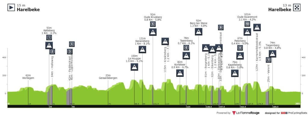 Le Katteberg permet de rompre la monotonie de la première heure de course, mais le reste des ascensions est réparti sur 100 kilomètres vertigineux. L'E3 Harelbeke est peut-être plus courte que la Ronde, mais peu de courses réunissent autant d'obstacles dans un espace aussi restreint, ce qui en fait un défi rare.