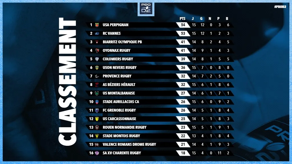 A la mi-championnat (ou presque), on retrouve malgré la situation sanitaire les grosses équipes qui composent cette Pro D2. Si Perpignan truste les premières places, et ce depuis quasiment le début de l’exercice, on peut voir qu’Oyonnax, Biarritz ou encore Nevers mènent également bon train, dans un championnat où tout le monde peut battre tout le monde, faut-il le rappeler.