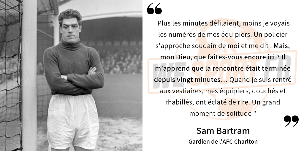 Ce jour-là, le brouillard gagne progressivement du terrain dans le stade. A l'heure de jeu, l'arbitre décide de l'interruption de la rencontre. Le gardien de Charlton Sam Bartram ne voit pas les joueurs quitter la pelouse et n'est pas du tout tenu au courant de l'arrêt du match. Un agent de police viendra le prévenir plus d'un quart d'heure plus tard. Une anecdote que le football anglais n'est pas prêt d'oublier…