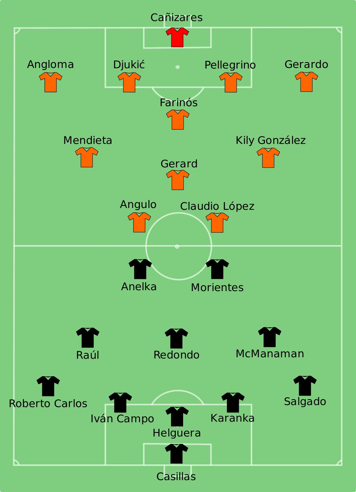 Après une première demie heure bien gérée, les hommes de Vicente Del Bosque vont alors passer la seconde. Et juste avant la mi-temps, sur un débordement de Salgado, Morientes pique sa tête et trompe Canizares. Premier coup de massue, juste avant la pause. Et le Réal ne va pas s’arrêter là, continuant de donner le tempo du match, accentuant au fil des minutes son pressing sur les joueurs Valencians. Peu après l’heure de jeu, l’Anglais Steve McManaman, doubla alors la mise sur une très belle acrobatie à l’entrée de la surface.